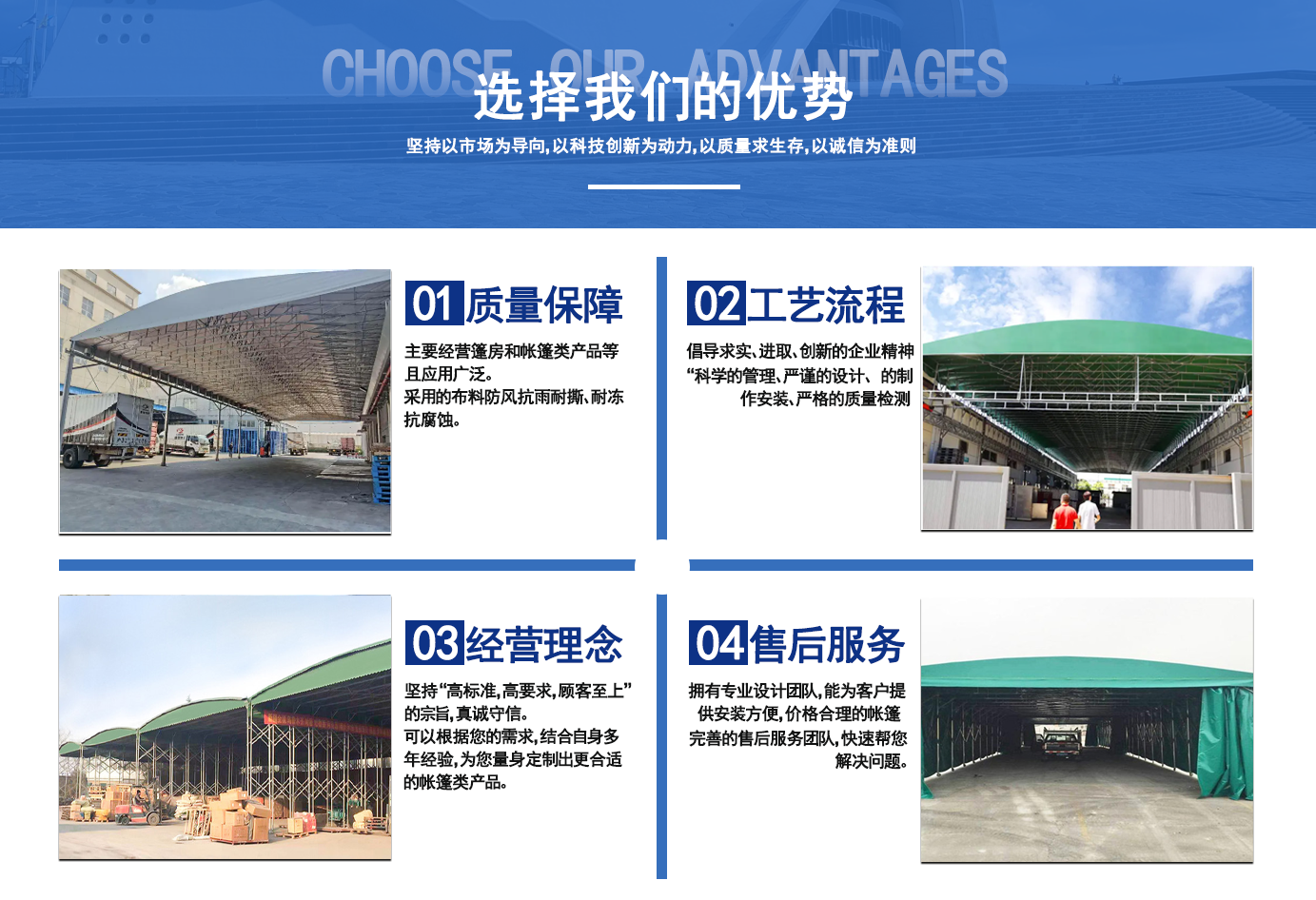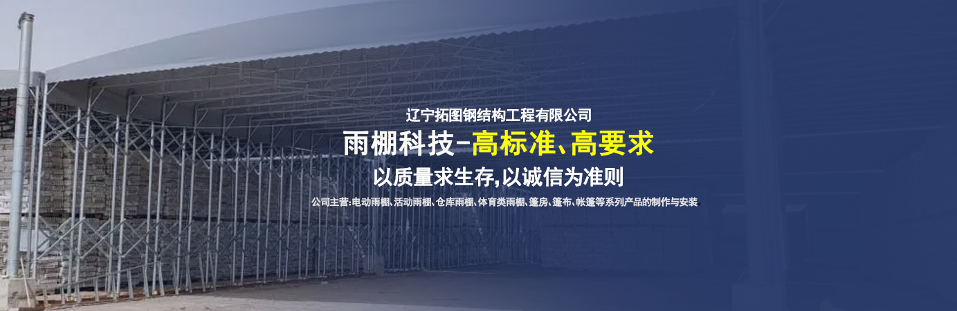 遼寧拓圖鋼結(jié)構(gòu)工程有限公司是一家專業(yè)從事推拉篷設(shè)計、制作、安裝、使用、維修的綜合性公司。公司主營:電動雨棚、活動雨棚、倉庫雨棚、體育類雨棚、篷房、篷布、帳篷等系列產(chǎn)品的制作與安裝。 遼寧拓圖鋼結(jié)構(gòu)工程有限公司堅持以市場為導向,以科技創(chuàng)新為動力,以質(zhì)量求生存,以誠信為準則,倡導求實、進取、創(chuàng)新的企業(yè)精神。“科學的管理、嚴謹?shù)脑O(shè)計、 的制作安裝、嚴格的質(zhì)量檢測、良好的后期服務成就企業(yè)的信譽,為您提供優(yōu)質(zhì)服務。 遼寧拓圖鋼結(jié)構(gòu)工程有限公司傾力于開發(fā)應用三維空間結(jié)構(gòu)與新材料的結(jié)合,將廣告藝術(shù)視覺表現(xiàn)形式與張力膜材科學的結(jié)合,推出多彩推拉蓬,依靠先進的科學技術(shù),將推拉蓬建筑表現(xiàn)形式無限延伸,立志走在建筑科學的前沿,引導建筑時尚潮流,我們的目標是使推拉蓬建筑在中國發(fā)展壯大。 遼寧拓圖鋼結(jié)構(gòu)工程有限公司憑著極強的事業(yè)熱情和豐富的專業(yè)經(jīng)驗以“勤勉進取、銳意創(chuàng)新、至誠至信”的精神使公司得到迅速健康發(fā)展,業(yè)務范圍遍及全國。科學的管理、嚴謹?shù)脑O(shè)計、高標準的制作安裝流程,嚴格把控產(chǎn)品質(zhì)量,熱誠的售后服務是企業(yè)競爭力的源泉。 遼寧拓圖鋼結(jié)構(gòu)工程有限公司人愿以最誠摯的態(tài)度,歡迎廣大客戶的蒞臨與溝通!愿為市場提供優(yōu)...